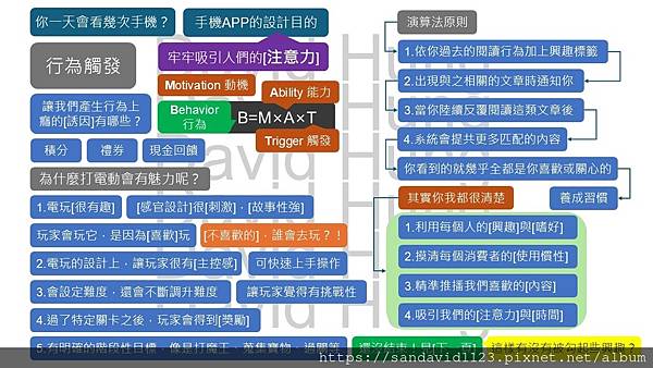 依據行為設計模型B=MAT(行為=動機×能力×觸發)的概念,設計者需由這三方面來提升[黏著度]。[動機]來源可以是追求成就感、社交認同或競爭心理;[能力則涉及操作介面的簡便性與任務易達性;[觸發]則是適時發出的推播通知或任務挑戰。